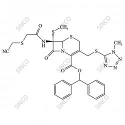 | Synonyms: | diphenylmethyl (7S)-7-({2-[(cyanomethyl)sulfanyl]acetyl}amino)-7-(methylsulfanyl)-3-{[(1-methyl-1,2,3,4-tetraazol-5-yl)sulfanyl]methyl}-6-oxo-2,6,7,7a-tetrahydroazeto[2,1-b][1,3]thiazine-4-carboxylate |